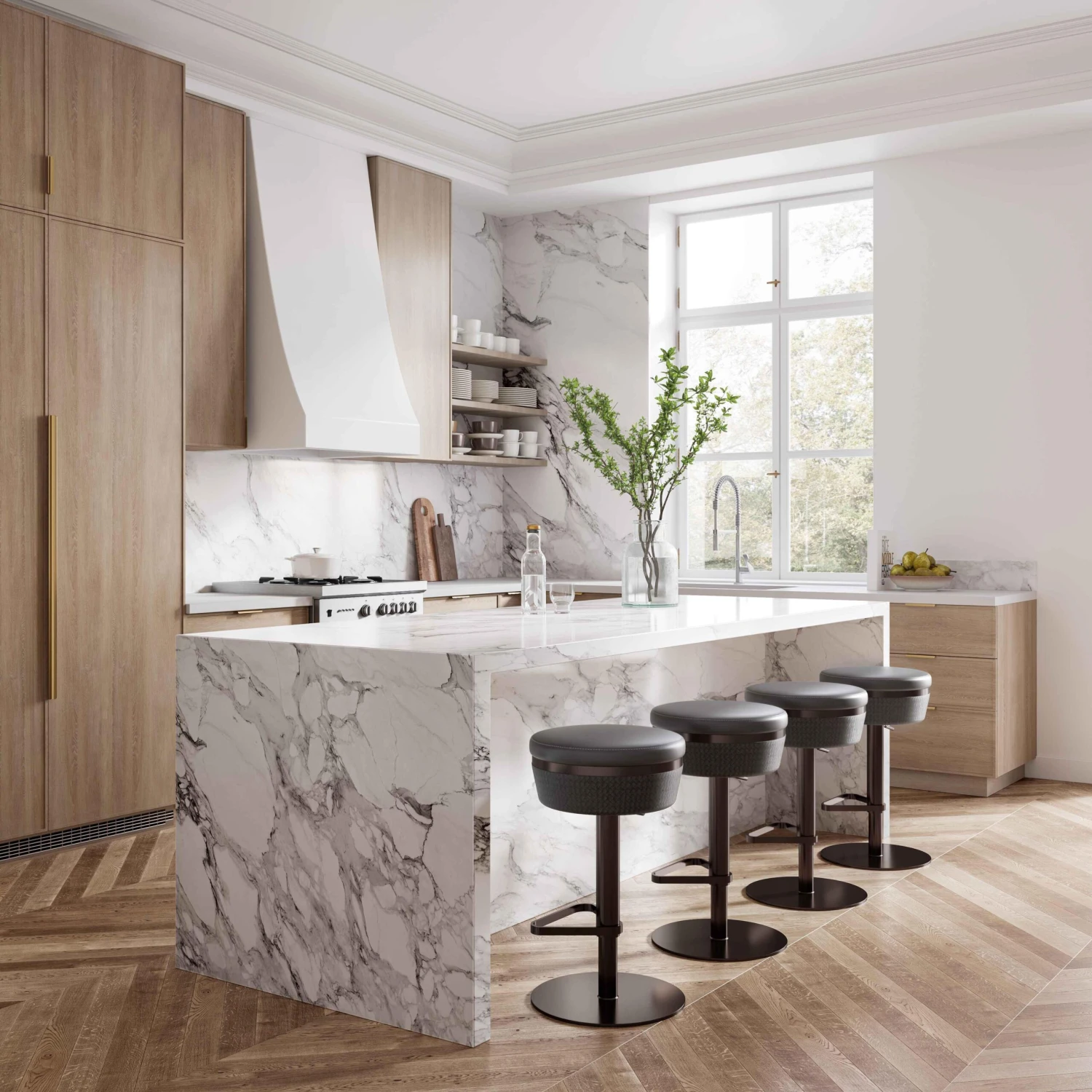 Bringing a minimalistic style with a glam twist to your kitchen space, meet the Astro Stool. The plush foam seating is upholstered in comfortable vegan leather, all accented by a dark grey band and sturdy stainless steel base. This stool is the perfect addition to a contemporary home while adding a subtle dazzle! Available in several upholstery options
