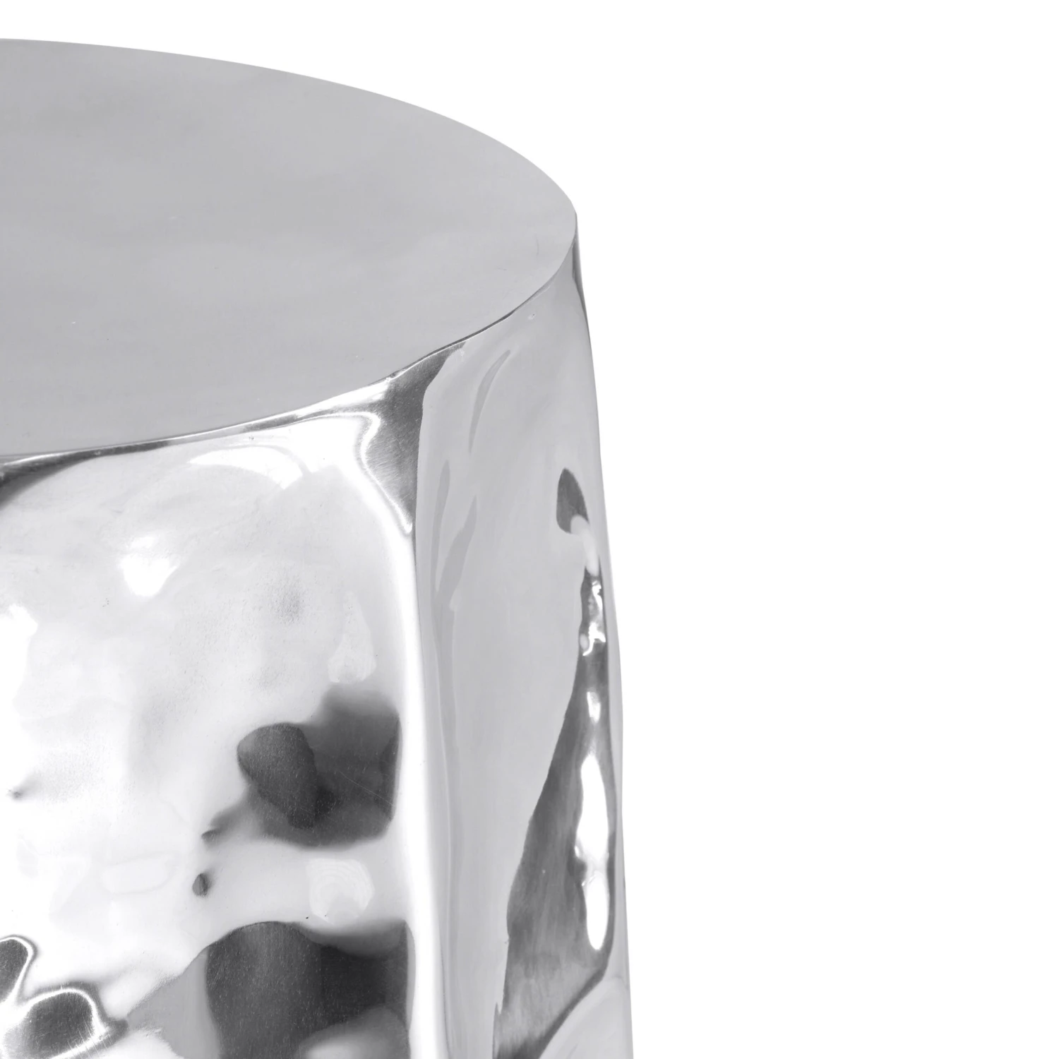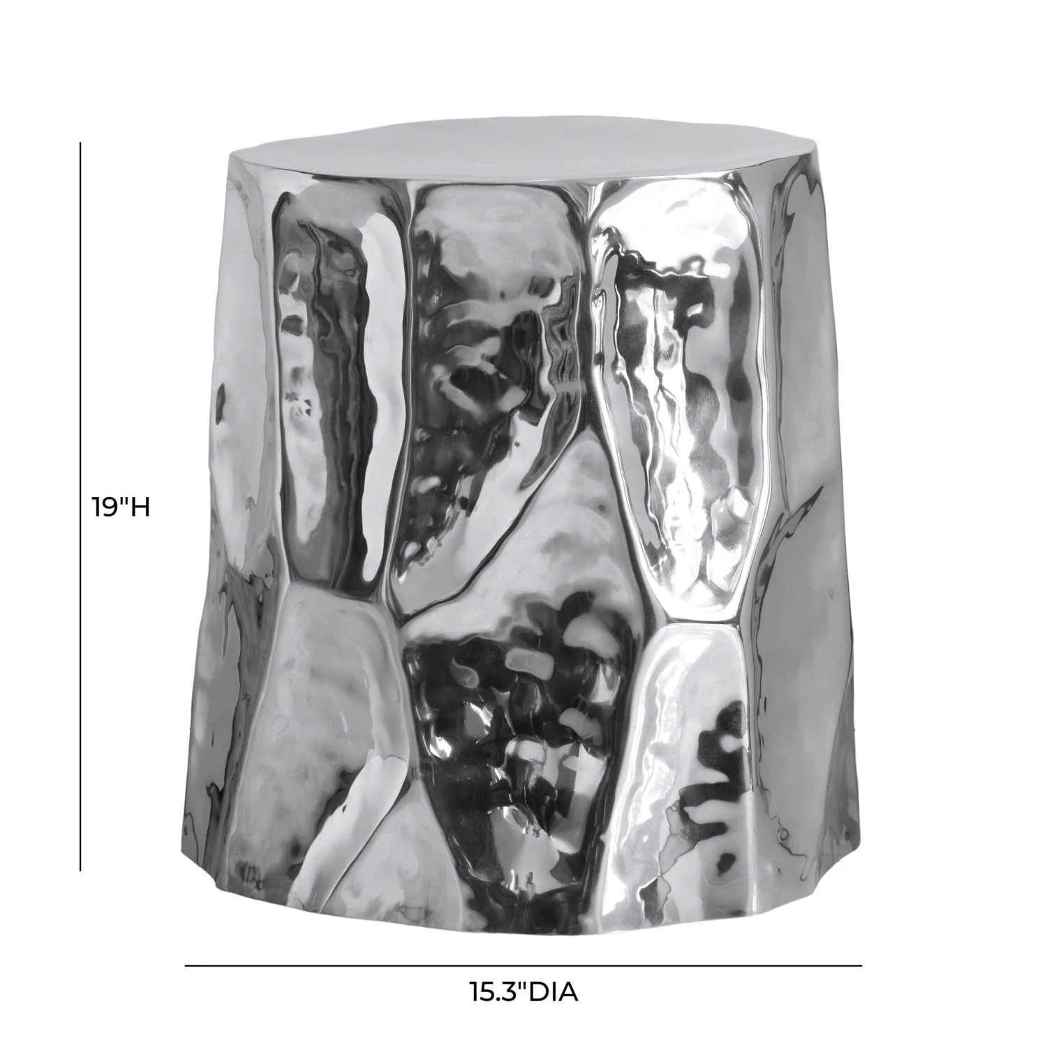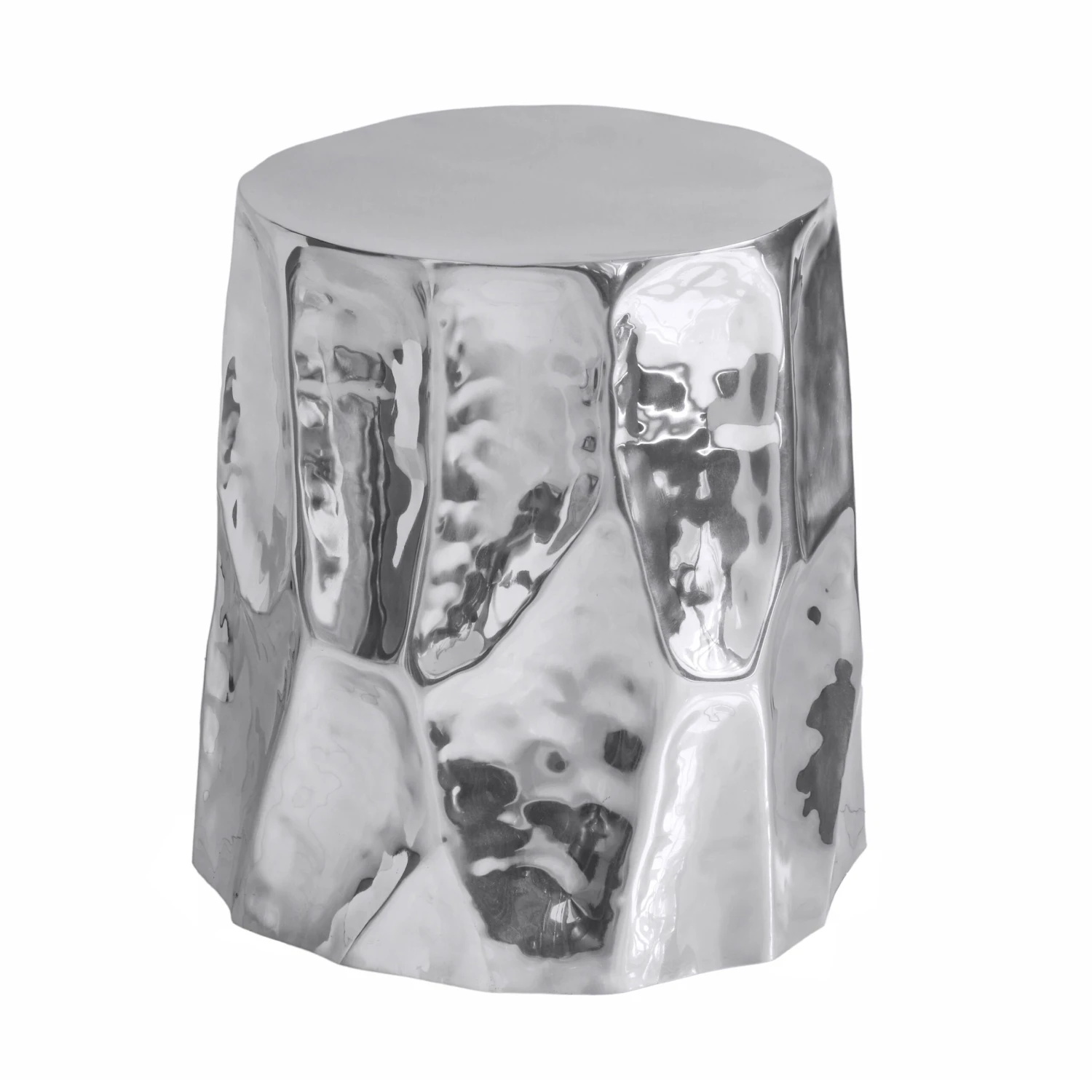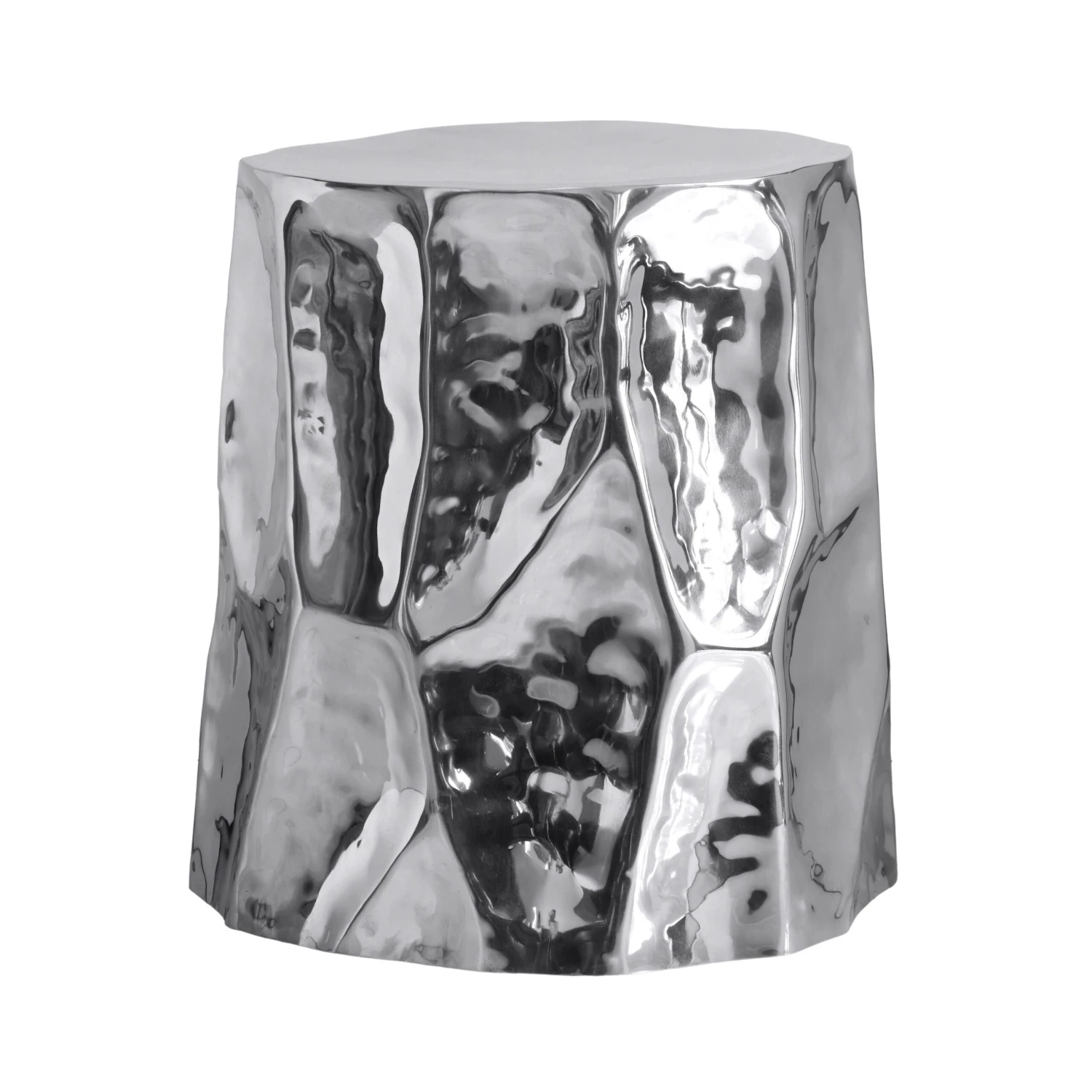The Forma Chrome Side Table exudes a captivating retro design with its crushed, organic shape, beautifully accentuated by a chromed, shiny finish. This unique table reflects light in a way that highlights its intricate folded metal aesthetic, turning heads in any room. Add one to your space and watch as it brings a huge personality boost to your decor.