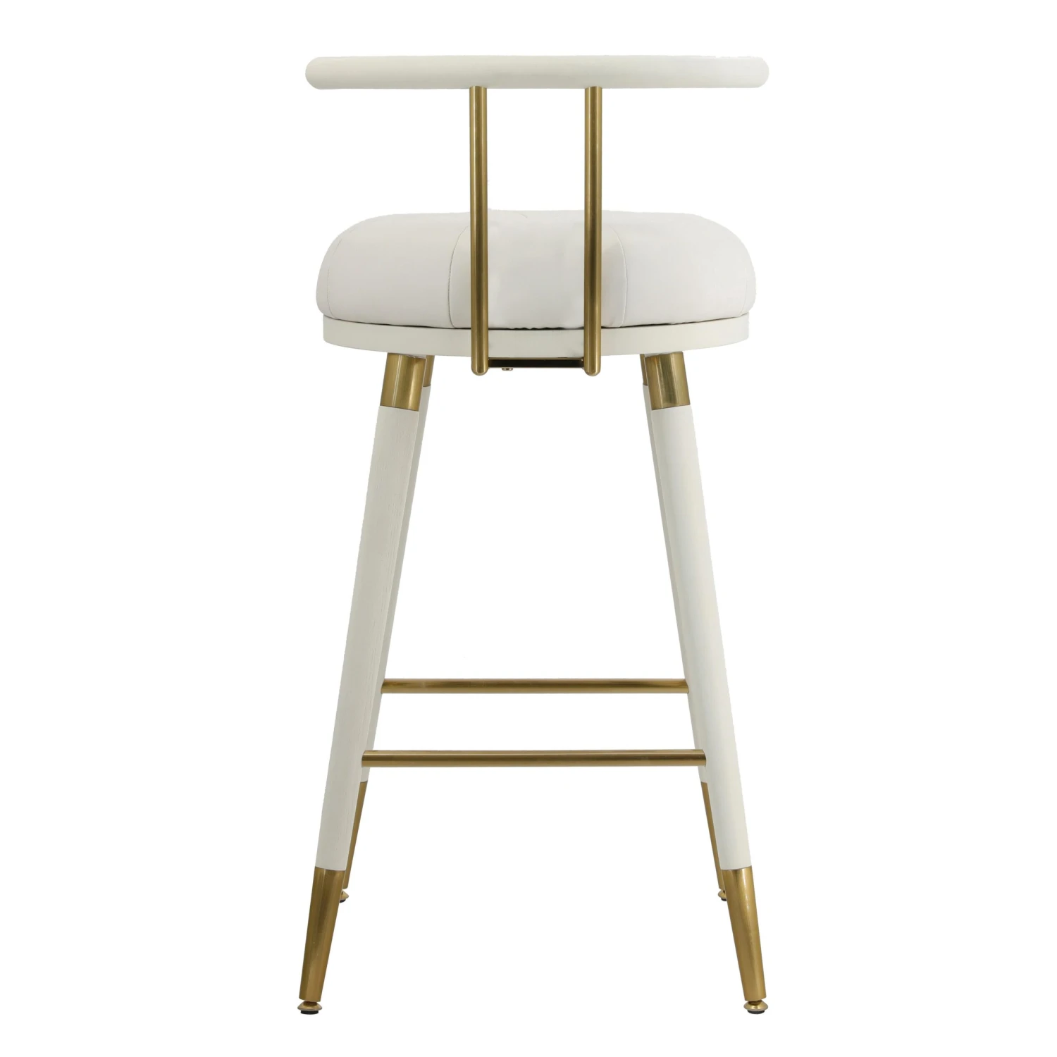 Upgrade your entertainment space or kitchen with the Juniper White Vegan Leather Stool! This stool features a vegan leather and gold iron accented base and backrest to add a touch of elegant charm and ensure durability. With a soft and luxurious white vegan leather seat, you can enjoy your drinks or meals in comfortable style.