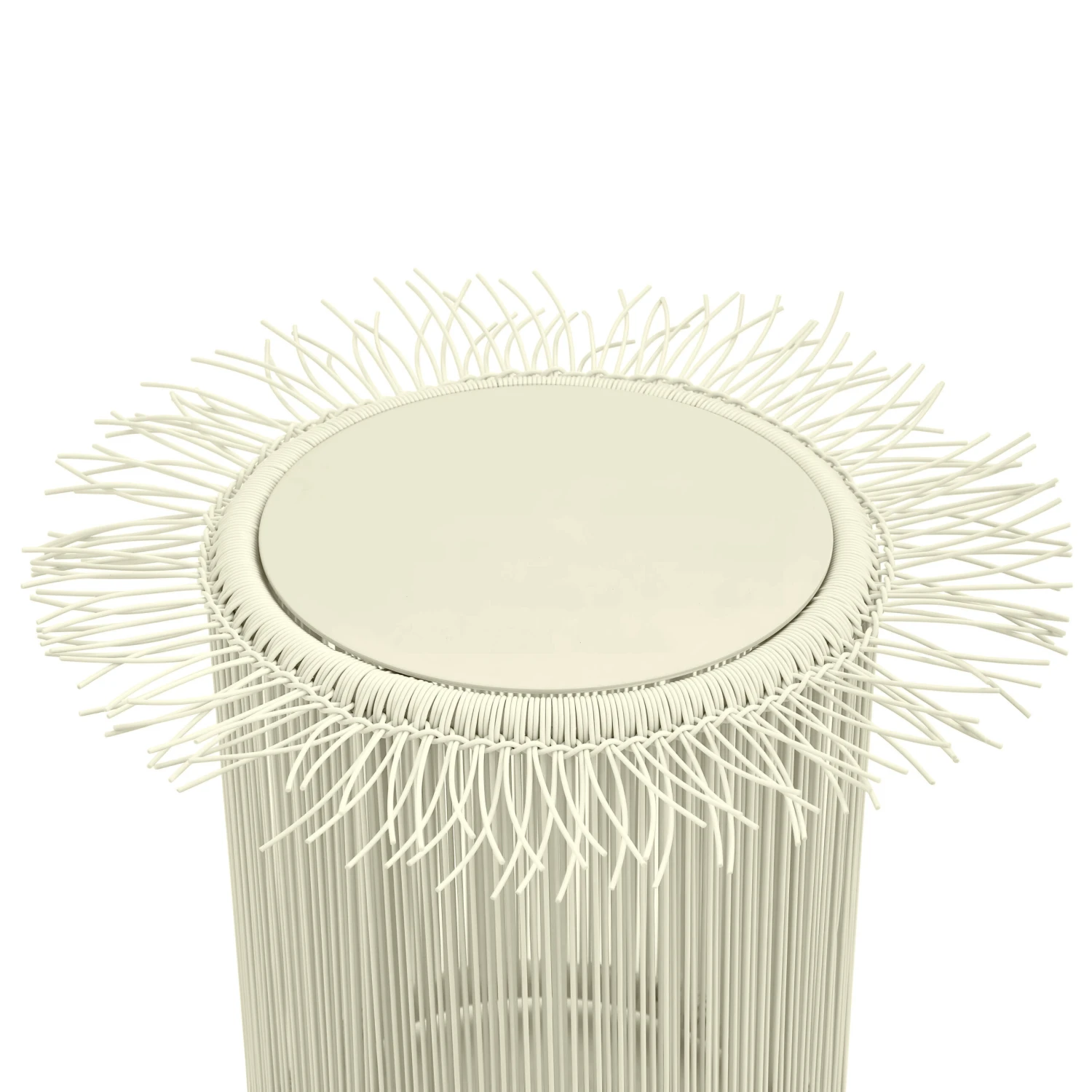 Add a bold statement to your outdoor lounging area with the Rafa Outdoor Side Table, available in vibrant blue or chic cream. Crafted from weather-proof wicker, this stylish table brings durability and unexpected flair to your space. With adjustable feet for added stability, the Rafa Side Table is not just cute but also a functional and eye-catching addition to your outdoor setting.