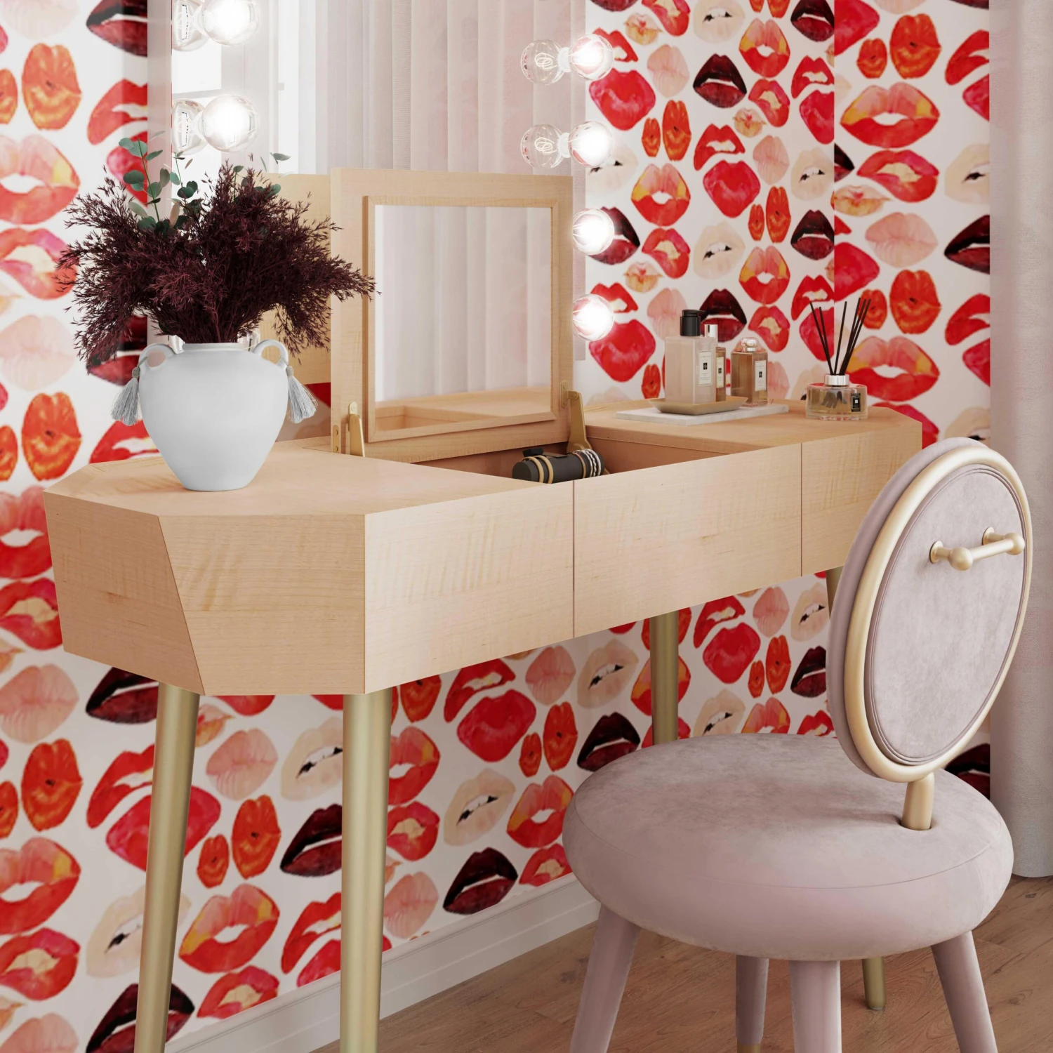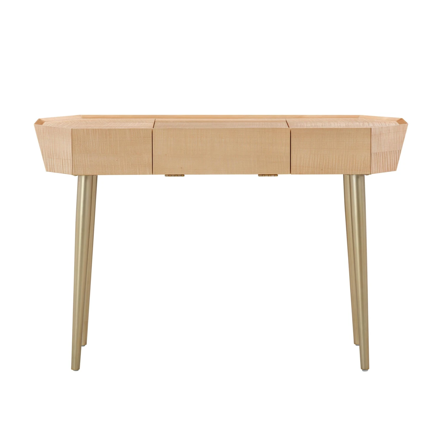 Introducing the Sadie Natural Maple Vanity Desk, a true masterpiece of design. Its captivating geometric shape, adorned with luxurious velvet-lined interior compartments for your precious jewelry, will steal your heart. The curled maple veneer and hidden drawers add an enchanting touch, while the raised lips ensure nothing rolls off during your GRWM routine. Versatile enough to be a vanity, spacious enough to be a desk, and stylish enough to grace your entryway, this exceptional piece promises to transform any space into a haven of sophistication and functionality.